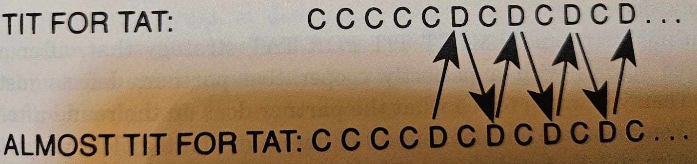 The winner of the first tournament, a program called “Tit-For-Tat” (or “TFT”), was simple: Cooperate on the first encounter, and then respond in kind thereafter to whatever the opponent does. As long as both players cooperate, cooperation continues – and both players do better than in any other scenario.
